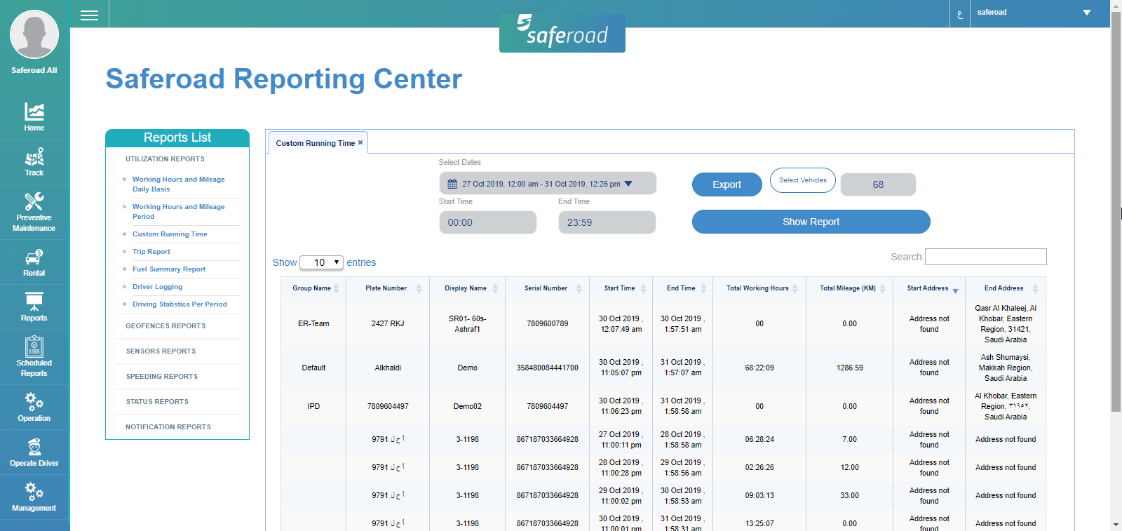 Custom Running Time Report, allows the user to view the vehicles running time in a specific period in a specific time and running means Engine On and the vehicle is moving. The report displays the total working Hours and Mileage for vehicles in a chosen period. If the vehicle did not run at the chosen period, it will not appear in the report.