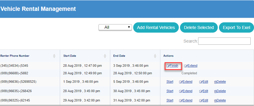 To Finish the rent before its End Date, click on Finish button in Actions column.