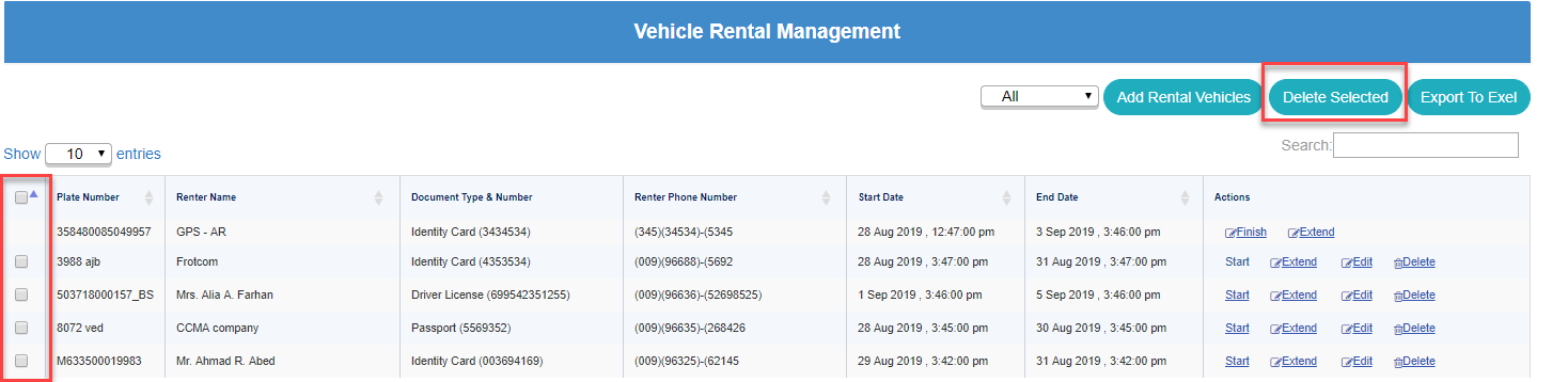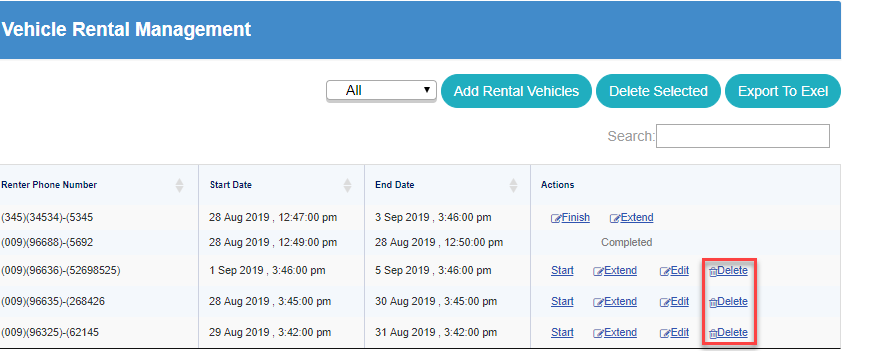 From Vehicle Rental Management screen, either delete one rent at a time by clicking on Delete button from Actions column for each rent.