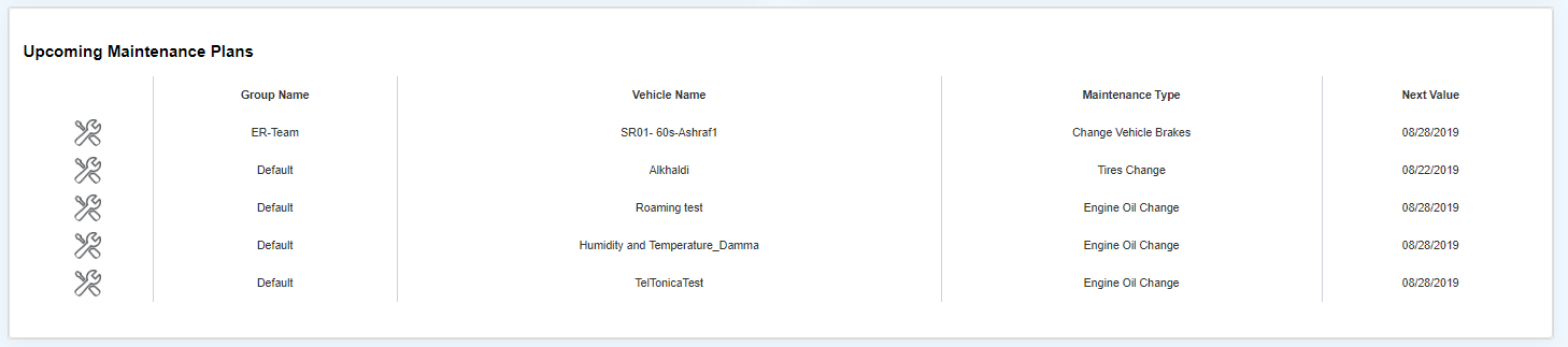 - Upcoming Maintenance Plans: top 5 coming Maintenance plans